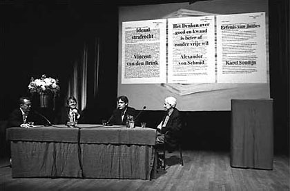 Presentator Alle Lansu (links) in gesprek met de genomineerden van de Jan Hanlo Essayprijs. Vlnr: Vincent van den Brink, Alexander von Schmid en Karel Soudijn Foto: Jean van Lingen