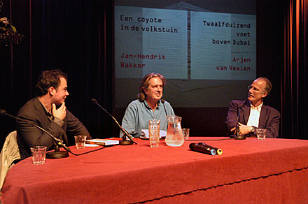 Wim Brands (midden) interviewt de genomineerden voor de kleine prijs: Arjen van Veelen (li.) en Jan-Hendrik Bakker (re.)