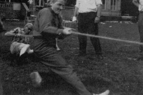 Touwtrekken voor het gebouw van de volkshogeschool Geerlingshof, Valkenburg |